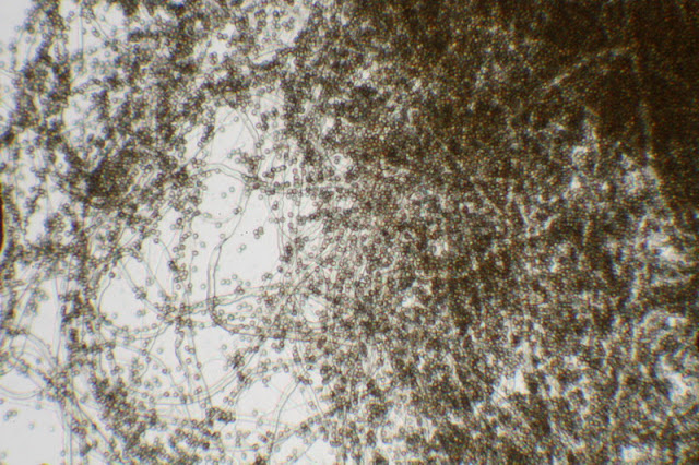 De que se trata de otro hongo que vive sobre él y que se está reproduciendo de forma asexual produciendo esporas por yemas, conidios.